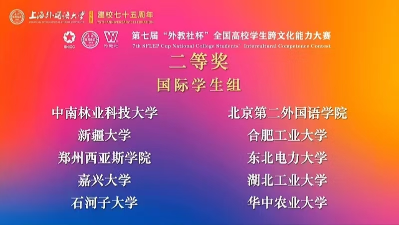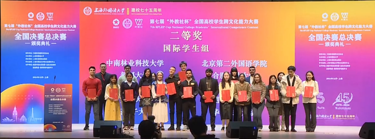 11月29日至12月1日,第七届“外研社杯”全国高校学生跨文化能力大赛总决赛在上海外国语大学圆满落幕。由我校推荐的3名分别来自韩国、泰国和土库曼斯坦的留学生组成的代表队,经过激烈角逐,荣获全国二等奖。